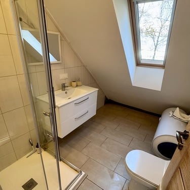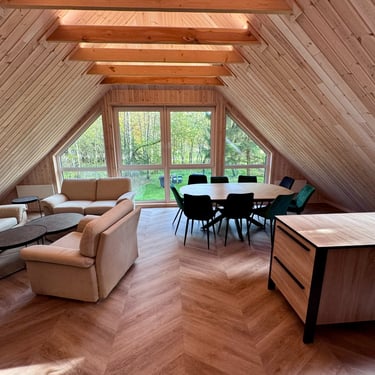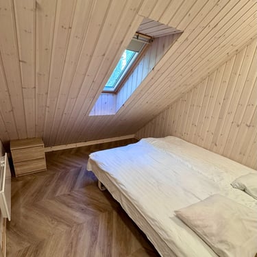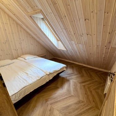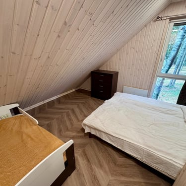 Naujiena! 5-ių kambarių butas mansardoje (8+1). Trys nedideli kambariai dviem asmenims, vienas nedidelis kambarys dviem asmenims ir vaikui iki maždaug 135 cm ūgio. (Patalynė ir užvalkalai yra). Bendra svetainė su virtuvės zona (šaldytuvas (su šaldikliu), indaplovė, indukcinė kaitlentė, gartraukis, virdulys, kavos aparatas Dolce Gusto, reikalingiausi indai ir įrankiai). Dušas, tualetas, plaukų džiovintuvas). Jums pageidaujant suteikiame rankšluosčius (išskyrus paplūdimio). Lauko baldai. Nemokamai galima naudotis šašlykine, tačiau atsivežti savo groteles, iešmus. Malkas galima įsigyti pas mus arba turėti savo. Į šį butą priimame ir su mažų veislių (iki 10 kg) augintiniais. Papildomo mokesčio netaikome, tačiau šeimininkai pasirūpina augintinio dubenėliais, guoliu, maistu, neleidžia miegoti lovoje, įsipareigoja augintinį prižiūrėti ir nevedžioti paplūdimyje.