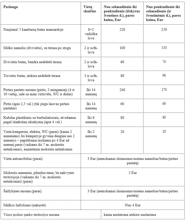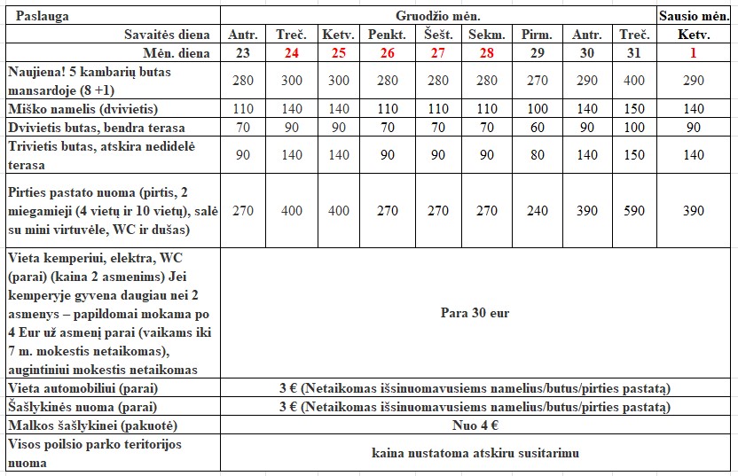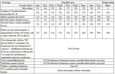 * šventinėmis dienomis galioja savaitgalio kainos. Jeigu atvykimo ar išvykimo diena yra šventinė, taip pat galioja šventinių dienų kaina.