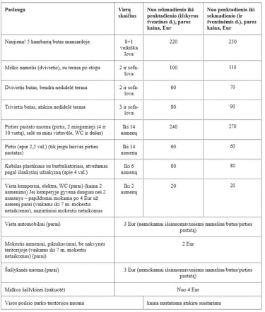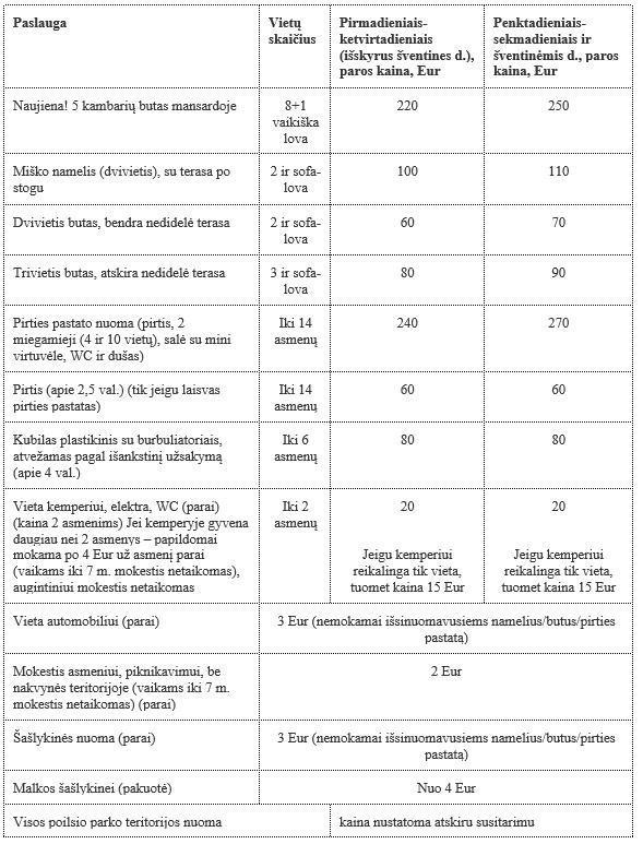 Vasaros sezono metu minimali poilsio namelių nuomos trukmė 2 paros. Vienai parai galime išnuomoti, tik jeigu lieka laisvas namelis/butas tarp išankstinių užsakymų.