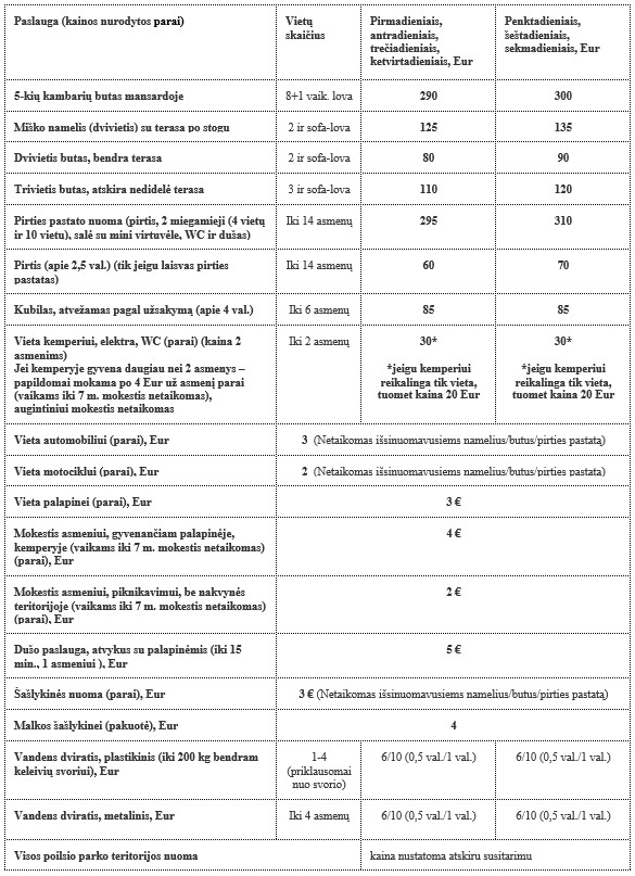 * šventinėmis dienomis galioja savaitgalio kainos. Jeigu atvykimo ar išvykimo diena yra šventinė, taip pat galioja šventinių dienų kaina.